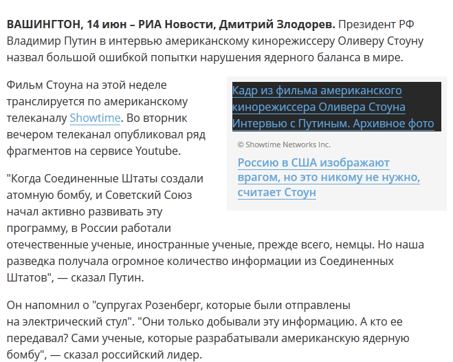 【環(huán)球網(wǎng)綜合報(bào)道】據(jù)俄新社6月14日?qǐng)?bào)道,俄羅斯總統(tǒng)普京在接受美國導(dǎo)演奧利弗 斯通采訪時(shí)稱,破壞世界核平衡的企圖是巨大錯(cuò)誤。