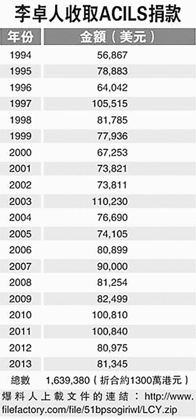 大公報文章說,香港網(wǎng)民“旺角腦場起底組”近日上載于網(wǎng)絡(luò)的大量文件揭露,李卓人所領(lǐng)導(dǎo)的“香港職工會聯(lián)盟(簡稱職工盟)”號稱政治中立組織,卻自1994年以來,每年均向美國國家民主基金會(NED)旗下的美國國際勞工團(tuán)結(jié)中心(ACILS)申請5萬至10多萬美元資助,至今已接受合共多達(dá)近164萬美元,折合約1300萬港元捐款。