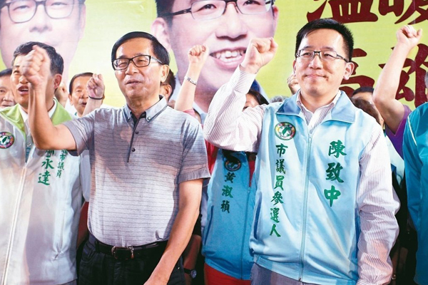 陳水扁日前參加兒子陳致中高市議員黨內初選造勢晚會,因上臺送好彩頭,被中監認定違反“不上臺”規定。(圖片來源:臺灣《聯合報》)
