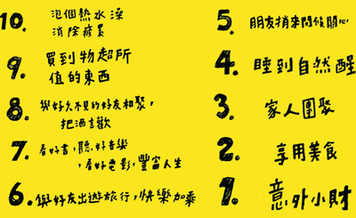 今年,兩岸的社會情緒“步調一致”,金秋時節,大陸流行:你幸福嗎?時逢歲末,臺灣流行小確幸,兩岸不約而同地對幸福做出思考和解讀。臺灣小確幸的流行源于網絡上一個不到2分鐘的短片,短片名為“全民小幸福”,在動感的背景音樂中,幾個快速的畫面配上一句結語,總結了10個小確幸,按順序為:發個小財;享用美食;家人團聚;睡到自然醒;朋友捎來問候;與好友出游旅行;看好書,聽好音樂,看好電影;好久不見的朋友把酒言歡;買到物超所值的東西;累了一天泡個澡……