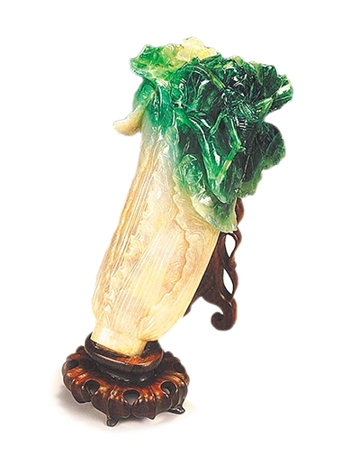 道光之后,清朝國力嚴重衰退,不但新疆的和田玉進貢完全停止,就連蘇州、揚州兩地的玉作坊也因兩次鴉片戰爭及太平天國起義而一蹶不振。但是由于西南貨運之路未斷以及慈禧太后對翡翠極度癡迷,翡翠在清朝晚期呈現出全國性流行態勢,從朝野到市井莫不趨之若鶩。受時代環境的影響,此時的翡翠件多由粵海一帶所制,無論是造型、工藝都不同于乾嘉時期,已然完成了清雅陳設到實用佩戴的轉變。這一點,從臺北故宮玉器展館及清代家具展館所展出的簪釵、扁方、耳環、手串、手鐲、帽正、翎管、戒指上便可得到印證,這些首飾或單獨成器,或與珊瑚、碧璽、各色寶石、燒藍等混合鑲嵌,華美精巧,為我們再現了一幅晚清宮眷生活圖。值得一提的是,從首都博物館展出的李蓮英扳指(傳為慈禧所賜)、榮祿帶鉤等翡翠物件來看,晚清時期人們對于翡翠已經有了更深的認識和更高的審美追求,滿綠冰透的高貨成了這個時期達官貴人們的新寵。與以上兩件翡翠相比,同為晚清物件的臺北故宮翠玉白菜在玉質上顯然不及,但其雕刻神妙,白菜、螽斯和蟈蟈所寄意的“清白傳家”、“螽斯衍慶”也正貼合了尋常百姓佩戴、賞玩翡翠的心理需求。所以,從這一點來看,翠玉白菜成為臺灣民眾的心頭好也在情理之中。(胡穎華)