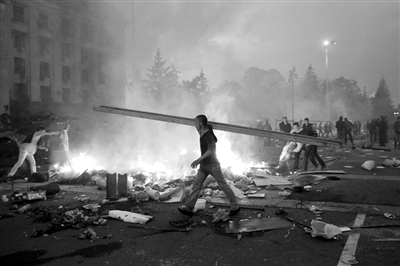 圖為5月2日,在烏克蘭南部城市敖德薩,工會大樓附近的一個臨時帳篷被燒毀。烏克蘭南部黑海沿岸城市敖德薩2日發生親政府與反政府兩派民眾沖突,導致43人死亡。新華社發