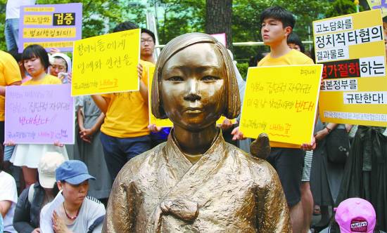 7月2日,在韓國首爾的日本駐韓國大使館前,民眾在“慰安婦”少女像旁手持標(biāo)語參加抗議活動。要求日本政府向“慰安婦”謝罪,并強烈反對日本通過解禁集體自衛(wèi)權(quán)的法案。新華社記者 姚琪琳攝