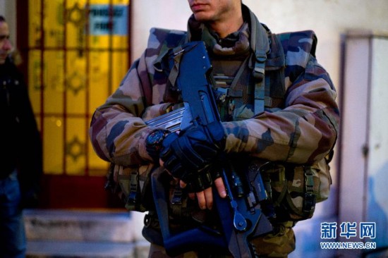1月21日,在法國首都巴黎城外的一個猶太教堂前,一名法軍士兵持槍警戒。法國巴黎《沙爾利周刊》雜志社1月7日遭恐怖襲擊后,法國政府立即加大安保工作力度。襲擊發(fā)生的當(dāng)天下午,法國總理府宣布,將首都所在的整個巴黎大區(qū)反恐預(yù)警方案“警惕海盜計劃”的警戒級別提至最高,并進(jìn)一步加強(qiáng)對新聞機(jī)構(gòu)、大型商場、交通系統(tǒng)和宗教場所的保護(hù)。法國反恐預(yù)警方案“警惕海盜計劃”的安全警戒級別有4級,政府總理有權(quán)根據(jù)實際情況和需要宣布或調(diào)整國家所處的警戒級別。目前,在法國全境執(zhí)行國內(nèi)安全任務(wù)的軍人已增加到1萬人以上,其中大約8000人執(zhí)行“警惕海盜計劃”。機(jī)場、車站和著名旅游景點等重要公共場所都加強(qiáng)了軍人值勤的部署力度。這是法國首次在本土動員如此多的軍人參與安保。新華社發(fā)