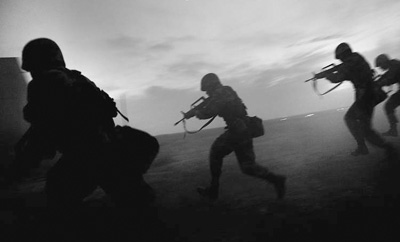 參加演習官兵驅逐趁暮色來襲之敵。程成攝