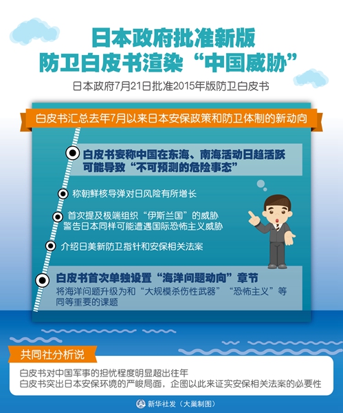 新華網北京7月22日電(記者趙悅 沈紅輝)日本政府21日批準2015年版防衛白皮書,加碼炒作“中國威脅論”,制造緊張氣氛,為強化安保政策、發展防衛體制并密切日美軍事同盟尋找借口。
