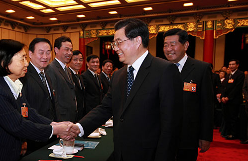 胡錦濤4日下午看望參加全國(guó)政協(xié)十一屆一次會(huì)議的民革、臺(tái)盟、臺(tái)聯(lián)委員,就對(duì)臺(tái)政策發(fā)表了講話。(圖片來源:新華社)