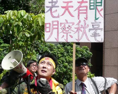 2名男子日前手持標語和擴音器專程嗆扁,抗議陳水扁A錢。