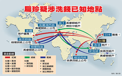 陳水扁家洗錢路線圖 資金流轉4大洲10地。(臺灣《聯合報》圖)