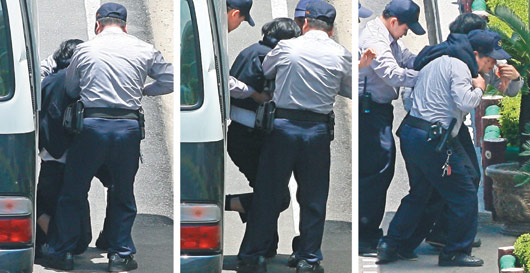 陳水扁昨天出庭祭出悲情招,意圖搶回517大游行的主導權。圖為陳水扁昨天被獄警撐扶回看守所。圖片來源:臺灣《聯合報》