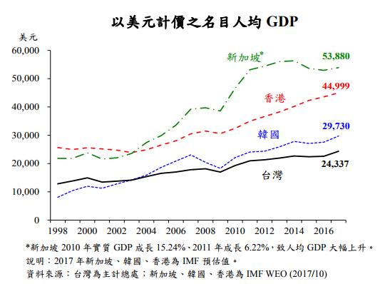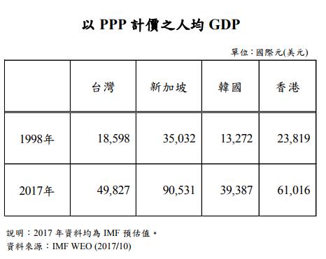 2018年4月2日,臺灣“立法院”第9屆第5會期“財務委員會”第11次全體“委員”會議中發布的“20年來(1998-2017)臺灣經濟成長率、通貨膨脹率及人均GDP與新加坡、韓國、香港之比較。”報告中明確顯示,無論以PPP(平均個人所得成長率)計價之人均GDP,還是以美元計價之名目人均GDP,臺灣都排在香港之后。