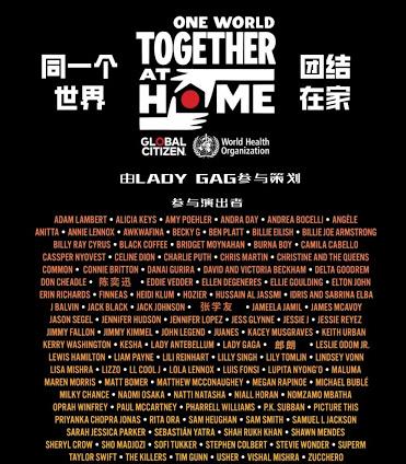 事實上,不僅Lady Gaga認真了,全世界巨星也很認真。為呼吁各國團結一致共克時艱,并向世界各地抗疫一線的醫護人員致敬,4月19日,一場名為“同一個世界:團結在家”慈善音樂會全球在線播放。這場演唱會全程長達8小時,演唱陣容堪稱殿堂級別的頂級配置。眾多巨星當中,我們還會發現郎朗夫婦、張學友、陳奕迅等音樂人也都參與其中。