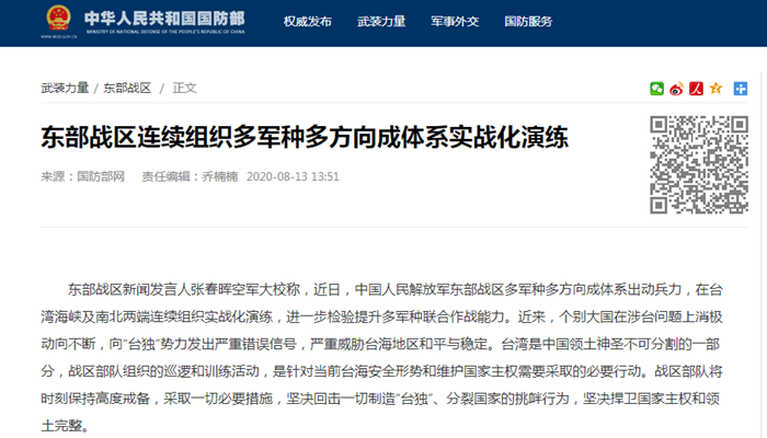 13日下午,中國人民解放軍東部戰區對外宣布,近日將在臺灣海峽及南北兩端連續組織實戰化演練,并明確指出,近來,個別大國在涉臺問題上消極動向不斷,向“臺獨”勢力發出嚴重錯誤信號,嚴重威脅臺海地區和平與穩定。