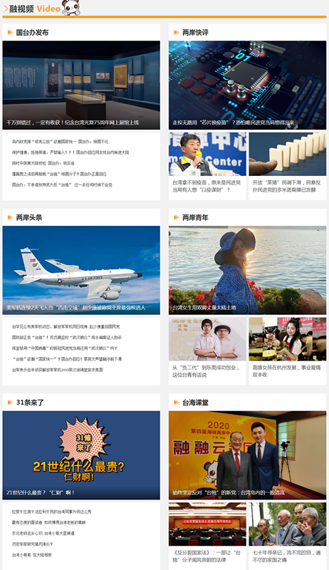 為適應互聯網視頻化趨勢,中國臺灣網在改革調整階段開設的《國臺辦發布》《兩岸快評》《兩岸頭條》《“31條”來了》《兩岸青年說》《臺海小課堂》《羽說臺灣》等精品視頻節目專欄,將以兩岸年輕網友聽得懂、愿意看的方式進行視頻化傳播。