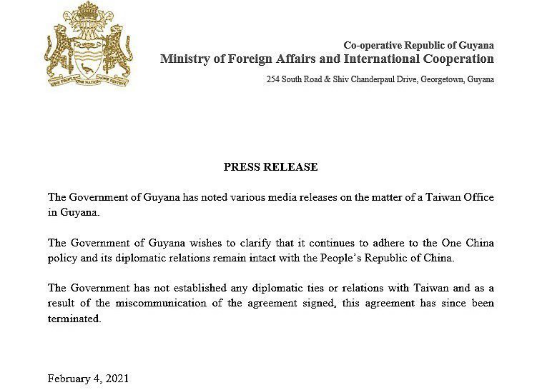 昨天(4日),民進(jìn)黨當(dāng)局外事主管部門宣布在圭亞那設(shè)立“臺(tái)灣辦公室”(Taiwan Office),并將其宣傳為所謂“外交突破”。沒想到不到24小時(shí),就慘遭打臉。圭亞那外交部于4日發(fā)表聲明,表示與臺(tái)灣方面的有關(guān)協(xié)議已因“溝通有誤”終止。聲明中,圭亞那表示將堅(jiān)持一個(gè)中國(guó)原則,維持與中國(guó)的外交關(guān)系。
