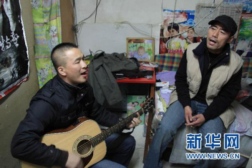 王旭(右)和劉剛在出租屋內唱歌。新華社記者 邢廣利 攝