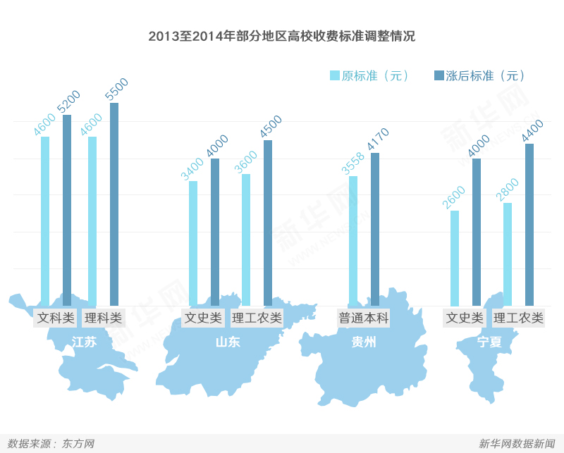 2013至2014年,天津、江蘇、福建、山東、湖北、湖南、廣西、貴州、寧夏、浙江、江西、廣東等地調整普通高校收費標準;