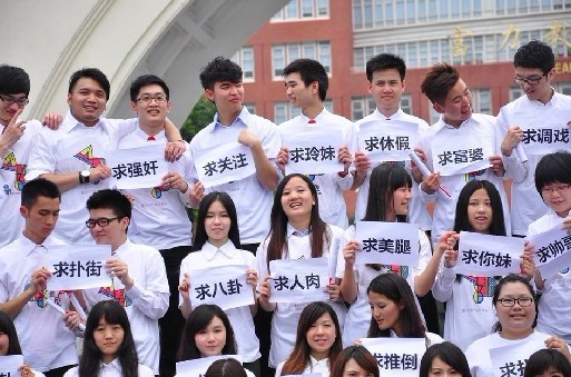我們不妨通過照片解讀一下這些“天之驕子”在內(nèi)心深處的表白,一個(gè)男孩子也敢于高舉“求強(qiáng)奸”的橫幅躋身于一群同處幾年的異性之中。或許我們可以認(rèn)為他是校園的愛情的失敗者,在面對成雙入對的校園風(fēng)景里他感受到了失落;亦或許是他對于所謂的“高、帥、富”的嫉妒與對真愛的渴求。如今,即便在象牙塔下,校園的愛情也遭受了金錢的侵襲,相對封閉的校園已經(jīng)接受了社會化的融入。