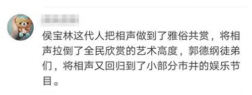 有網(wǎng)友直言:侯寶林這代人把相聲做到了雅俗共賞,將相聲拉到了全民欣賞的藝術(shù)高度,郭德綱徒弟們,又把相聲回歸到了小部分市井的娛樂節(jié)目。試想,如果一個藝人沒有起碼的藝德,心中沒有基本的美丑標(biāo)準(zhǔn),如何能做得到“雅俗共賞”?如何能不踩到觀眾厭惡的“雷區(qū)”?