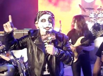 2010搖滾臺中樂團(tuán)節(jié)明天在臺中圓滿劇場登場,臺中市長胡志強(qiáng)(左二)特地扮成重金屬搖滾歌手現(xiàn)身記者會場,為活動暖身。