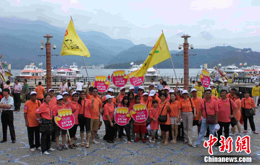 今年前7個月,臺灣著名景區(qū)日月潭接待到訪大陸客數(shù)量達(dá)到70萬人次,令同期景區(qū)到游人數(shù)達(dá)到400萬人次,連連刷新紀(jì)錄。圖為8月19日,來自廣州的“萬人游臺灣”的游客興高采烈地在日月潭前廣場上拍照留念。(圖片來源:中新社)