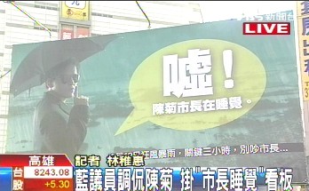 據(jù)臺(tái)灣《聯(lián)合報(bào)》報(bào)道,“噓!陳菊市長在睡覺。”偌大臺(tái)北車站大廳設(shè)置廣告,讓“睡菊”風(fēng)波延燒到臺(tái)灣北部。據(jù)透露,這是藍(lán)營最新的催票文宣,希望高雄人返鄉(xiāng)投票。