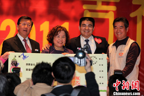 圖為陳光標(右2)應邀參加新竹縣政府舉辦的歲末送暖活動,“入鄉隨俗”改以支票形式分別致贈弱勢團體及弱勢兒童400萬元新臺幣、60萬人民幣善款。中新社記者 董會峰 攝