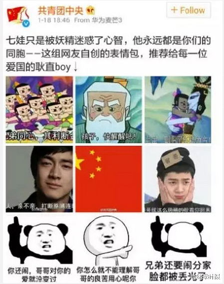 當(dāng)許多人還在憂心民進(jìn)黨重新在臺灣執(zhí)政會否帶來惡果時,一場由兩岸草根網(wǎng)友打響的“戰(zhàn)爭”卻意外地率先在Facebook登場了。這場以“發(fā)圖片表情互嗆”方式展開的網(wǎng)絡(luò)混亂,又被稱為“FB表情包大戰(zhàn)”,看起來就跟大陸網(wǎng)友經(jīng)常在微博里充滿逗趣惡搞的“撕逼大戰(zhàn)”一樣,但其背后卻讓人讀出了兩岸青年對深度溝通的渴望:你見過“撕”到最后變成“一家人”的嗎?你見過費力給“敵方”找臺階下的嗎?你見過罵著罵著就開始互相求結(jié)識、求旅行貼士甚至求交友的嗎?這也讓筆者聯(lián)想到了不久前臺灣藝人周子瑜與羅志祥說自己是中國人時引發(fā)的網(wǎng)絡(luò)風(fēng)波。原來兩岸青年人網(wǎng)絡(luò)上的那些事兒,真的能折射出兩岸關(guān)系許多值得玩味甚至感慨的深意。
