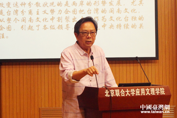 福建省廈門(mén)市閩南文化研究會(huì)會(huì)長(zhǎng)陳耕圍繞“閩南文化研究新世紀(jì)的回顧與新時(shí)代的前瞻”進(jìn)行主題發(fā)言。(中國(guó)臺(tái)灣網(wǎng) 張潔 攝)