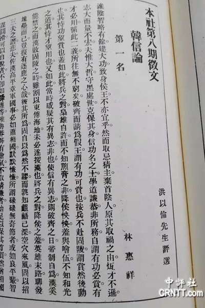 林惠祥《韓信論》第1頁。(圖片來源:香港中評社)