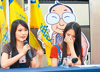 雙胞胎姐妹陳珮瑜(左)、陳珮涵,為挺胡志強自拍音樂影片,慘遭惡搞影射成酒店小姐,淚灑記者會場。