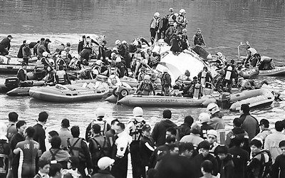 本報記者于中午12時許趕到失事現(xiàn)場。事發(fā)地點在臺北和新北市的交界處,河兩旁是寬闊的空地、高架橋和高速公路。從高處可以看到,失事飛機只有小部分機身露出水面,且斷成兩截。10數(shù)艘橡皮艇圍繞在旁,搜救人員從水面上一個機艙門進入救人。