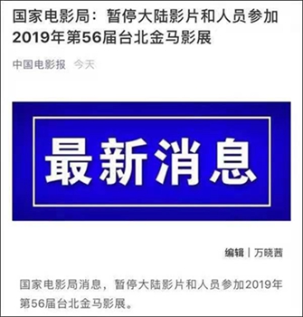繼不到一周前文旅部公告暫停大陸居民赴臺個人游試點之后,國家電影局今天上午發布消息,暫停大陸影片和人員參加2019年第56屆臺北金馬影展。