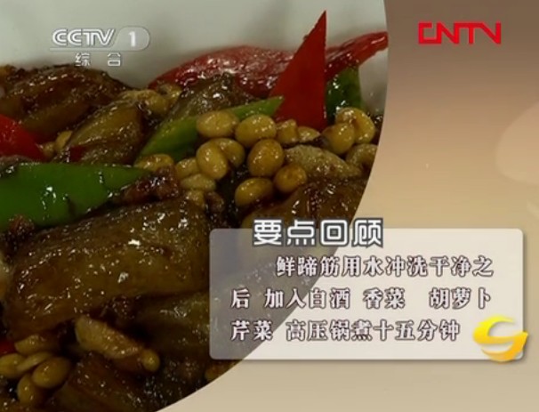 channelId 1 1 《天天飲食》 20120105 黃豆燒蹄筋 8f13f4fb0fa941c79c0b2235a200cb20 2 本節目介紹了“黃豆燒蹄筋”的制作方法: 1、主料:牛蹄筋; 2、輔料:黃豆、肉末; 3、調料:辣醬、桂皮、八角; 4、制作方法:(1)洗凈鮮蹄筋后,加入白酒、香菜、胡蘿卜、芹菜,高壓鍋煮十五分鐘;(2)熱鍋涼油放入蔥姜蒜、八角、桂皮炒出香味之后,烹入醬油和水,燒開之后撈出調料;(3)倒入蹄筋,加入鹽、胡椒粉、黃豆,開大火把蹄筋煮爛之后,潷出湯汁;(4)鍋中倒入色拉油和香油放入大蒜和肉末炒散之后調入白糖,炒化之后倒入牛蹄筋和黃豆;(5)沖入少許的涼水,烹入醬油、鹽、辣醬,出鍋前淋上水淀粉、放入青紅椒即可。(天天飲食 2012年 第5期)
