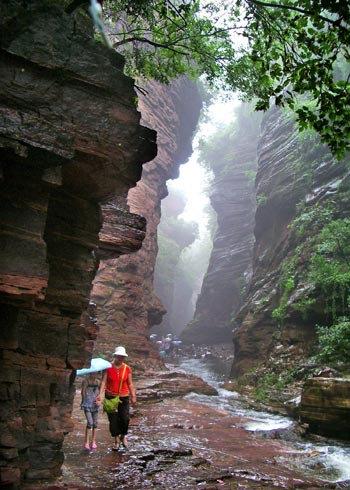 龍潭大峽谷是一條由紫紅色石英砂巖經流水追蹤下切形成的U型峽谷,全長12公里,谷內嶂谷、隘谷呈串珠狀分布,云蒸霞蔚,激流飛濺,紅壁綠蔭,懸崖絕壁,不同時期的流水切割、旋蝕,磨痕十分清晰,巨型崩塌巖塊形成的波痕大絕壁國內外罕見。景區的六大自然謎團(水往高處流、佛光羅漢崖、巨人指紋、石上天書、蝴蝶泉、仙人足跡)七大幽潭瀑布(五龍潭、龍涎潭、青龍潭、黑龍潭、臥龍潭、陰陽潭、蘆葦潭)八大自然奇觀(絕世天碑、石上春秋、陰陽潭甕谷、五代波紋石、天崩地裂、通靈巷谷、喜鵲迎賓、銀鏈掛天)令人驚嘆不已,流連忘返。紅巖絕壁,飛瀑幽潭,狹溝深谷,奇石綠蔭,組成世界上罕見的山水畫廊。