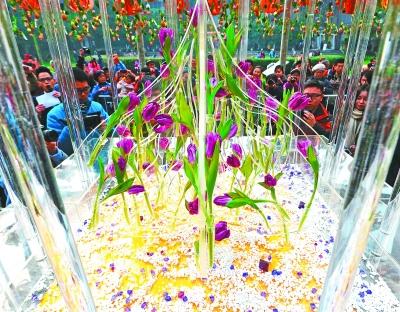 記者現場看到,展出的“國泰”郁金香均為鮮切花,花朵呈深紫色,尚未完全開放。葉片邊緣有稀疏的“鋸齒”,看上去有點像鳥類的羽毛。所有的“國泰”都被插在玻璃試管中,以延長花期。