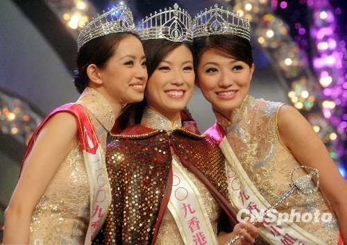 全港矚目的選美盛事二00九香港小姐競選決賽二十二日晚圓滿結束。芳齡二十三歲的劉倩婷(中)勝出,榮登港姐冠軍寶座。亞軍是李姿敏(右),熊穎詩奪得季軍(左)。 中新社發 鄧慶樂 攝