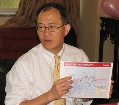10月29日,臺灣水泥有限公司董事長辜成允,介紹公司在大陸投資發展的計劃。當日,福州臺泥水泥有限公司二期75萬噸擴建工程如期竣工。這標志著臺灣最大水泥企業--臺灣水泥在大陸的“深耕戰略”又邁進一步。新華社記者 來建強攝