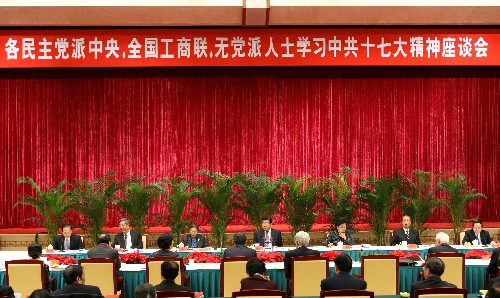 座談會上,民革中央主席何魯麗、民盟中央主席蔣樹聲、民建中央主席成思危、民進中央主席許嘉璐、農工黨中央主席蔣正華、致公黨中央主席羅豪才、九三學社中央主席韓啟德、臺盟中央主席林文漪、全國工商聯主席黃孟復、無黨派人士陳章良先后發言。他們暢談了學習中共十七大精神的體會,高度評價了十六大以來我國改革開放和現代化建設取得的巨大成就,表示要認真學習貫徹好中共十七大精神,自覺接受中國共產黨的領導,進一步履行參政議政和民主監督職能,堅持走中國特色社會主義政治發展道路,為奪取全面建設小康社會新勝利而奮斗。