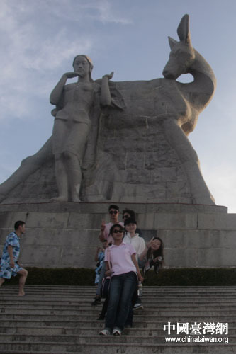 來(lái)自臺(tái)灣的營(yíng)員在中國(guó)大陸版圖的石雕前留影