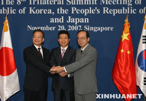 新華網(wǎng)新加坡11月20日電(記者 許鉞乃 胡曉明) 第八次中國(guó)、日本、韓國(guó)領(lǐng)導(dǎo)人會(huì)議20日在新加坡舉行。中國(guó)國(guó)務(wù)院總理溫家寶、日本首相福田康夫和韓國(guó)總統(tǒng)盧武鉉出席會(huì)議。盧武鉉主持會(huì)議。三國(guó)領(lǐng)導(dǎo)人對(duì)一年來(lái)三國(guó)合作的進(jìn)展表示滿意,確定了今后的合作項(xiàng)目,并就共同關(guān)心的國(guó)際和地區(qū)問(wèn)題交換了意見(jiàn)。