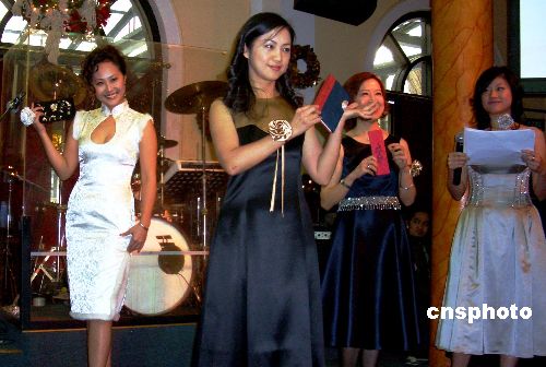 資料圖片:上海臺商圈內富有盛名的“一八八一”臺灣職業女性聯誼會舉辦盛大的圣誕慈善“走秀”活動,為內地貧困女童募集善款。圖為一群臺商太太身著盛裝登上T臺,展示愛心義賣的小禮物,轟動全場。 中新社發 許曉青 攝