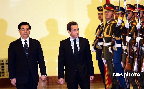 十一月二十六日,中國國家主席胡錦濤在北京人民大會堂舉行儀式歡迎來訪的法國總統(tǒng)薩科奇。 中新社發(fā) 盛佳鵬 攝