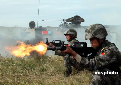 8月15日,參加“和平使命——2007”上海合作組織武裝力量聯(lián)合反恐軍事演習的中方參演部隊,進駐切巴爾庫爾演習場以來,進行緊張的分練、合練和重點課目的訓練。圖為中方參演官兵對目標進行射擊。 中新社發(fā) 張雷 攝