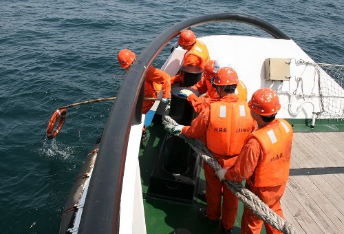 2007年5月14日,北海救助局“北海救131”輪船員在打撈沉船雜物。當(dāng)日,交通部救撈系統(tǒng)又增派兩艘救助船舶和一架固定翼飛機(jī)繼續(xù)加緊對(duì)韓國(guó)籍遇險(xiǎn)貨輪“金玫瑰”的海上搜救和油污清理工作。至此,交通部救撈系統(tǒng)共派出3艘救助船舶,2架救助直升機(jī)和1架固定翼飛機(jī)全力參與搜救工作。據(jù)了解,目前“金玫瑰”貨輪沉沒(méi)位置已被鎖定,同時(shí)船體在海底的姿態(tài)也被探明,為下一步搜救和布設(shè)航標(biāo)提供了可靠數(shù)據(jù)。 5月12日3時(shí)許,韓國(guó)籍“金玫瑰”貨輪在煙臺(tái)海域與一艘集裝箱船發(fā)生碰撞后沉沒(méi),船上16名船員至今下落不明。 新華社記者 朱崢 攝