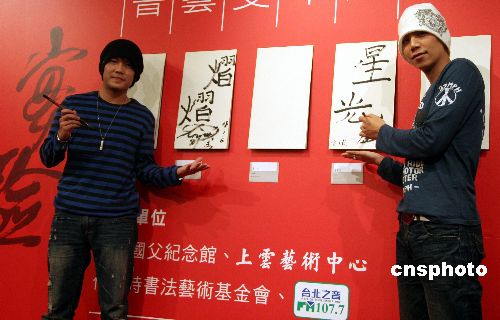 臺(tái)灣當(dāng)紅藝人“星光二少”潘裕文、許仁杰在臺(tái)北“傳統(tǒng)與實(shí)驗(yàn)書(shū)藝雙年展”開(kāi)幕式上現(xiàn)場(chǎng)揮毫,為展覽捧場(chǎng)助興。 中新社發(fā) 孫自法 攝