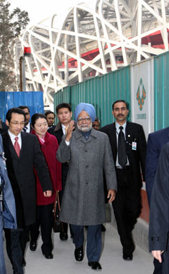 1月13日,剛剛抵達中國訪問的印度總理曼莫漢·辛格在北京參觀2008奧運工程展示中心。這是辛格從國家體育場“鳥巢”旁走過。(新華社記者劉衛兵攝)