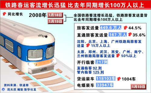 新華網北京1月20日電(齊中熙、厲于)鐵路春運自1月18日啟動以來客流增長十分迅猛。記者20日從鐵道部春運辦了解到,兩天來鐵路旅客發送量皆比去年同期增長100萬人以上。其中1月19日全國鐵路旅客發送量為449.6萬人,同比增長138.5萬人,增長44.5%;直通旅客發送量為167萬,比去年同期增長43.9萬人,增長35.6%。
