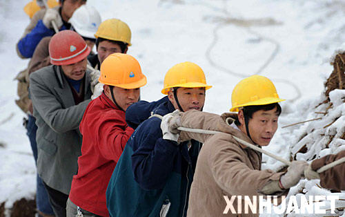 2月5日,中共中央政治局常委、國務院總理溫家寶前往貴州指導抗災救災工作。這是溫家寶踏著冰雪登上黔南觀音山,前去看望正在緊張搶修輸電線路的電力工人。新華社記者 姚大偉 攝