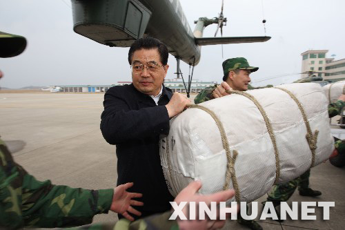 2月5日至6日,中共中央總書記、國家主席、中央軍委主席胡錦濤來到廣西桂林市考察抗災救災工作。這是胡錦濤同正在執行救災任務的廣州軍區某集團軍陸航團的官兵一起裝運救災物資。新華社發